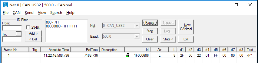 如果发送成功的话,在CANreal上部会显示从CAN bus中抓取的,刚刚发送成功的CAN数据。