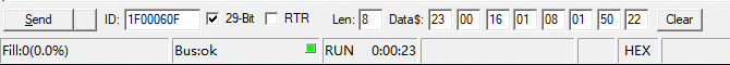 使用esd CANreal软件在CAN bus中发送CAN-ID范围在(0x1f000600 – 0x1f00060f)之间的CAN数据。在CANreal界面底部输入要发送的29-bit CAN-ID数据。