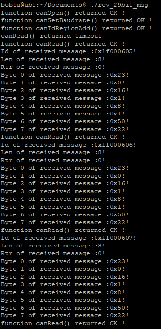 将程序编译连接gcc -o rcv_29bit_msg rcv_29bit_msg.c -lntcan,然后执行一下。可以看到从esd CANreal中发送出来的29-bit CAN-ID的数据被成功接收到了。