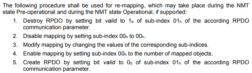 使用同一个RxPDO(如ID 0x211),内嵌两个bytes的数据,同时控制两个DIO8装置的Output。配置两个装置前请参考CiA DS301 7.5.2.36章节Object 1600h to 17FFh: RPDO mapping parameter中关于re-mapping procedure,和7.5.2.35章节 Object 1400h to 15FFh: RPDO communication paramete所述内容