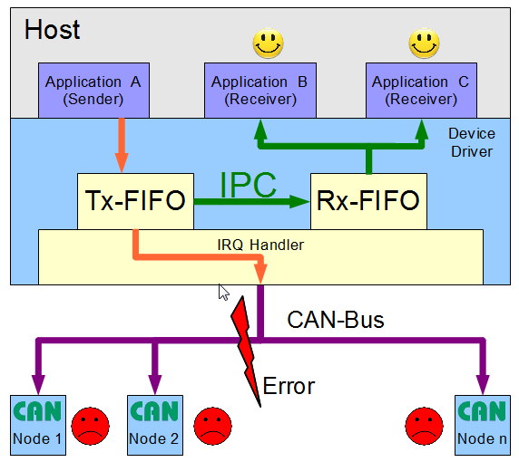 - Interaction机制能确保收到的CAN消息是自己节点在CAN总线上发送成功的CAN消息,避免了如下情况的发生。 如下图所示的情况,在同一台主机内,运行三个应用程序(A,B和C)。A发送的CAN消息,虽然在CAN总线上没有传送成功,但是此CAN消息通过IPC方式从A的Tx-FIFO传送到B和C的Rx-FIFO中,使得B和C收到CAN消息。从而B和C会误以为A的CAN消息发送成功了。