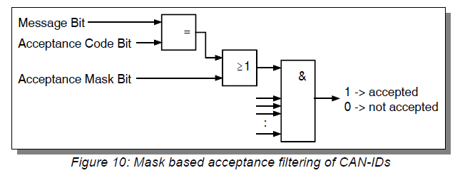 The acceptance filter is realized by a logical AND-combination of an acceptance code, followed by a logical OR-combination with the acceptance mask according to the following figure.