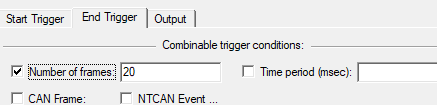 config start trigger and end trigger. 8.1 CAN->Trigger & Logging...打开配置触发启动Start Trigger和触发结束End Trigger界面。 8.2 收到特定CAN消息后触发抓取。 8.2.1 例如配置收到CAN消息ID为0x10,数据为01后,触发启动抓取logfile。参见下面图二输入数据。 8.2.2 同时配置抓取20条CAN消息后,触发结束抓取logfile。参见下面图三输入数据。点击"Start->"按钮后,CANreal底部出现"TRIG:WAITING"的字样。 8.2.3 在demo system的Linux PC上使用cantest工具发送一条CAN ID为0x10,数据为01的CAN消息(cantest 0 3 0x10 0x10 1 10 100 100 5000 0 1 0x10)。当CANreal收到此消息后,会触发启动抓取Logfile,请参见下面图四,Trg栏位中有面小红旗icon边上有字母S,代表此条CAN消息为触发启动的CAN消息,并且底部CANreal status栏位出现"TRIG:TRIGGERED"字样。 8.2.4 在demo system的Linux PC上使用cantest工具发送CAN ID为0x10,数据为01的CAN消息超过20条以后(cantest 0 3 0x10 0x10 1 10 100 100 5000 0 30 0x10),请参见下面图四,Trg栏位中在第21条记录处有个字母N的字样代表Number Of Messages触发了停止抓取logfile。并且底部CANreal status栏位有"TRIG:ENDED"字样。