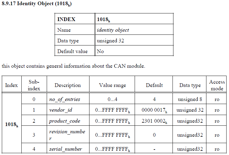read value from object 6.1 选择 "1018 Identity Object",此Object的格式如下图四。 6.2 读取此Object的Value,内容如图五。 6.2.1 sub 0为sub-index 0,value是4,说明有4条记录,分别为sub-index 1~4。 6.2.2 sub-index 1 vendor_id value 0x00000017,是指esd 公司在CiA组织中的Vendor ID号为0x17。 6.2.3 sub-index 2 product_code value 0x23010002,是CAN-CBX-DIO8产品在esd公司内部的订货号。 6.2.4 sub-index 3 revision_number value 3,是CAN-CBX-DIO8软件版本号。 6.2.5 sub-index 4 serial_number value 0xC7C60533,是此CAN-CBX-DIO8序列号。