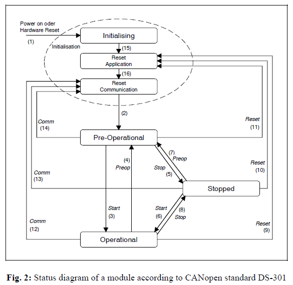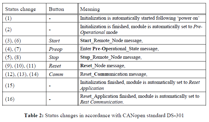 change NMT state 5.1 Start: CANopen status Operational. 5.2 Preop: CANopen status Pre-Operational. 5.3 Reset: CANopen initialization status Reset Application. Then the module automatically gets into Pre-Operational status via Reset Communication. 5.4 Comm: CANopen initialization status Reset_Communication. Then the module automatically gets into Pre-Operational status. 5.5 Stop: CANopen status Stopped. 5.6 详见下面图二。