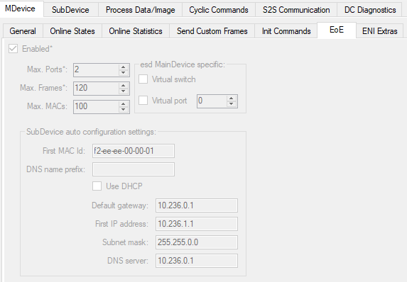- In SubDevice->Mailbox->EoE, Select "IP Port", Uncheck "Use DHCP", set "IP address: 10.236.1.1 ; Subnet mask: 255.255.0.0 ; Default gateway: 10.236.0.1 ; DNS server: 10.236.0.1"