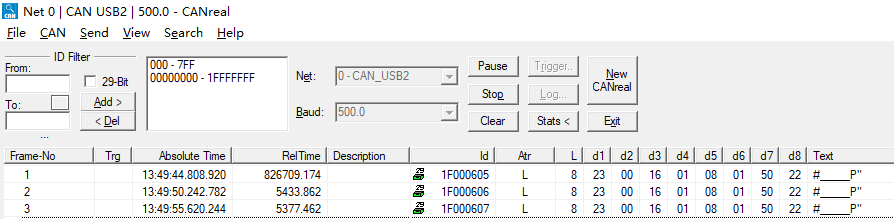 如果发送成功的话,在CANreal上部会显示从CAN bus中抓取的,刚刚发送成功的CAN数据。