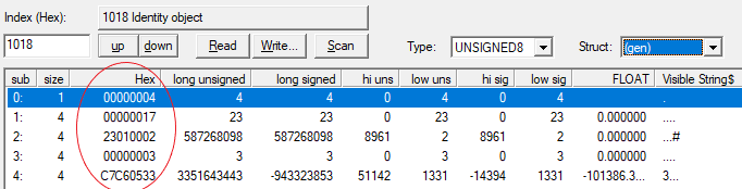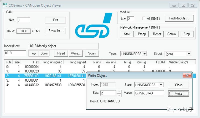 read value from object 6.1 选择 "1018 Identity Object",此Object的格式如下图四。 6.2 读取此Object的Value,内容如图五。 6.2.1 sub 0为sub-index 0,value是4,说明有4条记录,分别为sub-index 1~4。 6.2.2 sub-index 1 vendor_id value 0x00000017,是指esd 公司在CiA组织中的Vendor ID号为0x17。 6.2.3 sub-index 2 product_code value 0x23010002,是CAN-CBX-DIO8产品在esd公司内部的订货号。 6.2.4 sub-index 3 revision_number value 3,是CAN-CBX-DIO8软件版本号。 6.2.5 sub-index 4 serial_number value 0xC7C60533,是此CAN-CBX-DIO8序列号。
