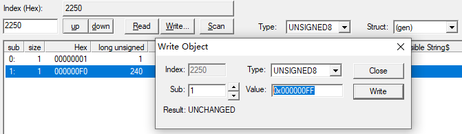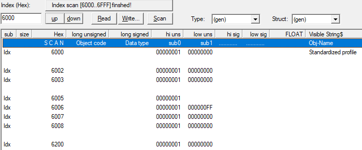 scan multiple objects 8.1 scan所有Objects Index from 6000 to 6FFF。 8.2 在"Index(Hex):"栏位中输入6000,点击"Read"按钮。 8.3 点击长条下拉菜单,选择"Index Scan (current index:) 6000...6FFF",