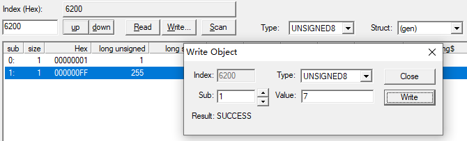 图十 Value 7 write to Object Index 6200 of CAN-CBX-DIO8 by COBview