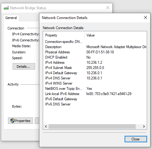 - Bridge EtherCAT Virtual Port adapter to the Ethernet adapter which connect to LAN or other PC, so that a Network Bridge adapter is created, and then configure its IPv4 address as below.